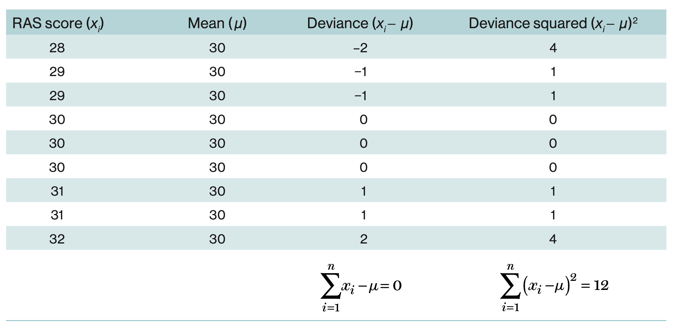 \[ = (28-30) + (29-30) + (29-30) + (30-30) \\+ (30-30) + (30-30) + (31-30) + (31-30) + \\(32-30)\\ = -2 + (-1) + (-1) + 0 + 0 + 0 + 1 + 1 +2 \\ = 0 \]
